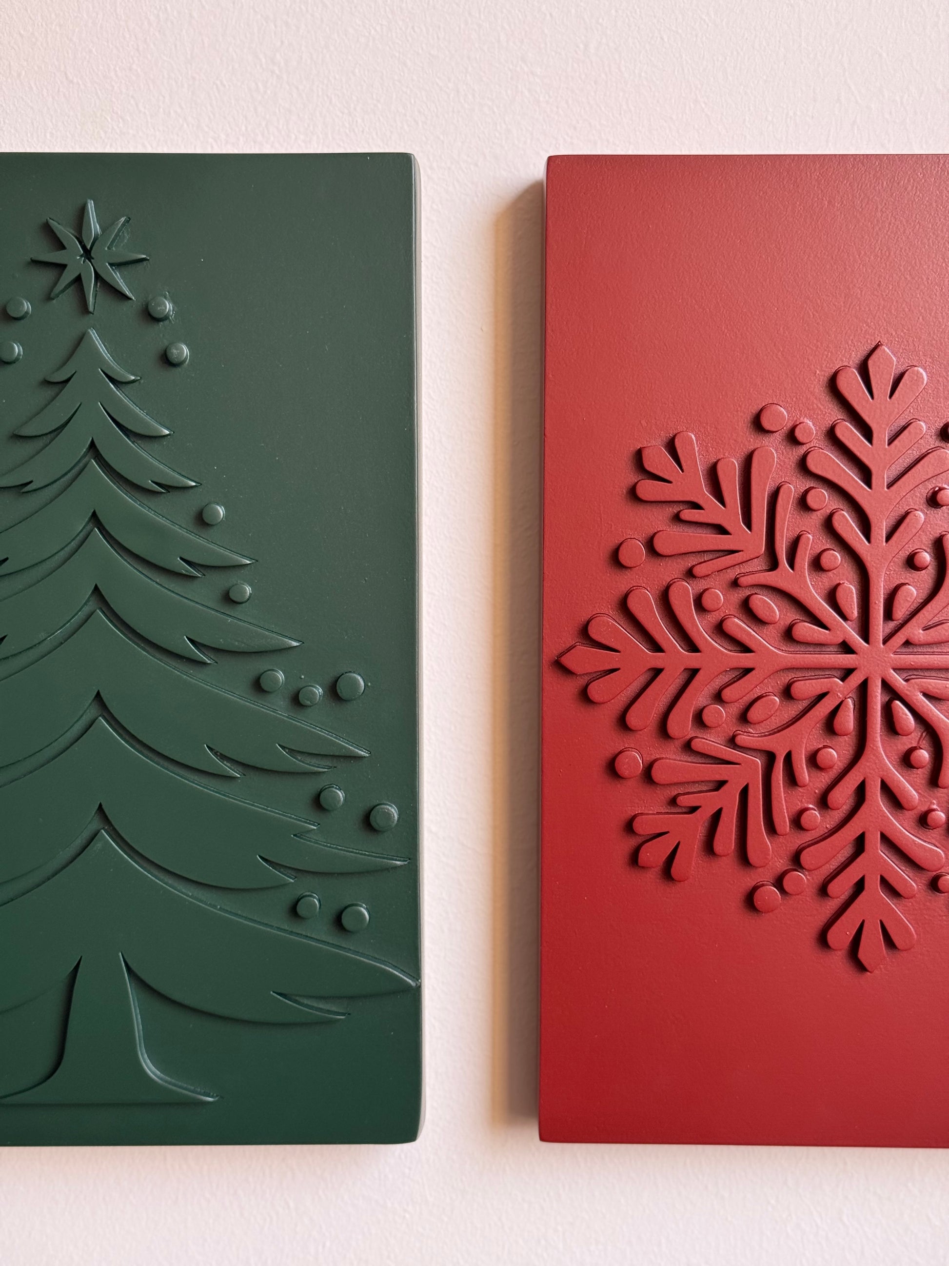 Each piece features a raised 3D relief design — a bold snowflake on red and a Christmas tree on deep green — giving your space a warm, festive touch.