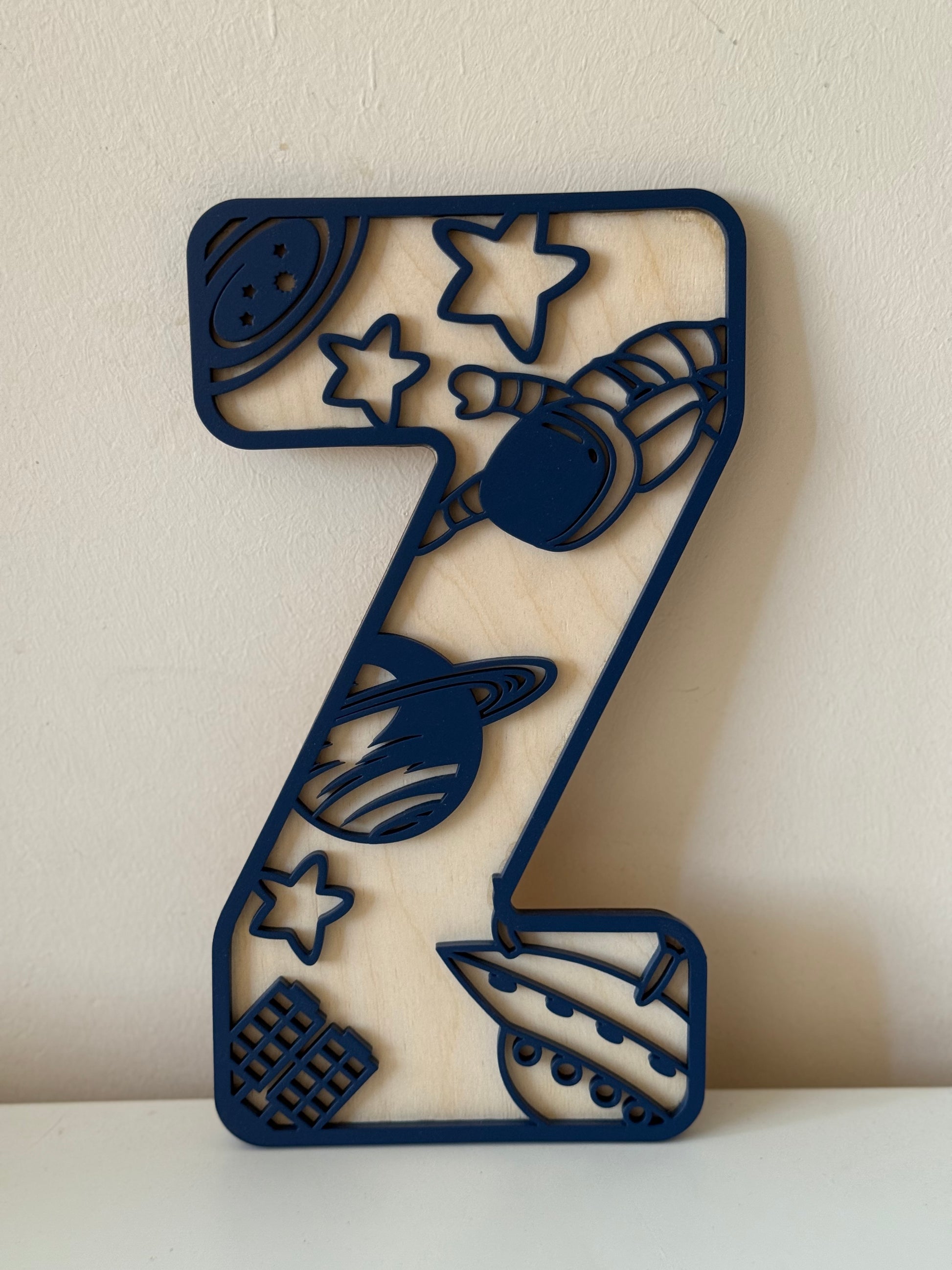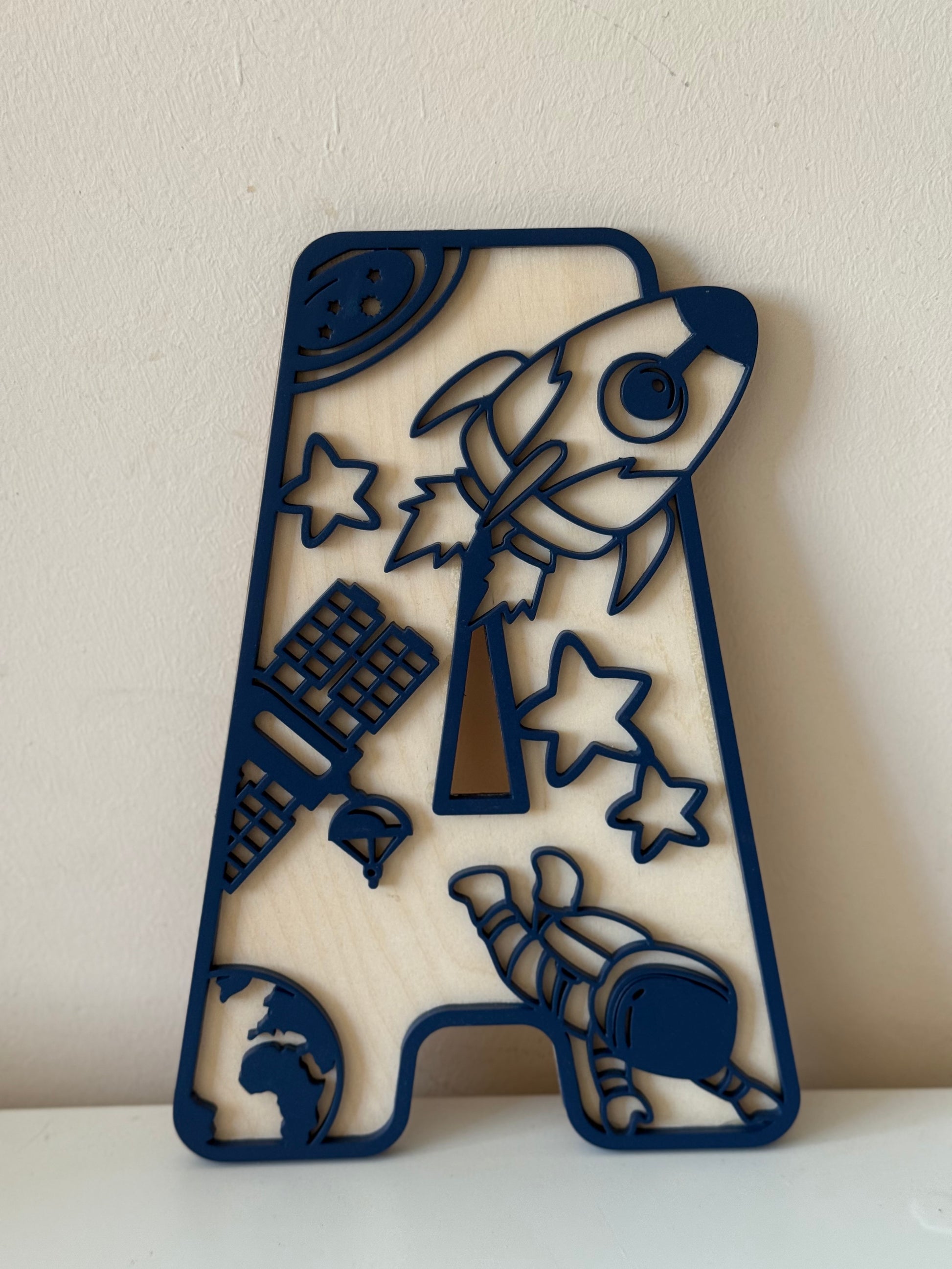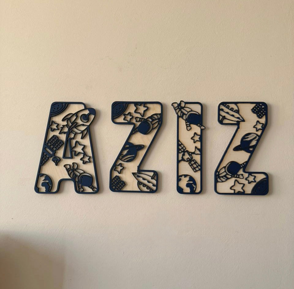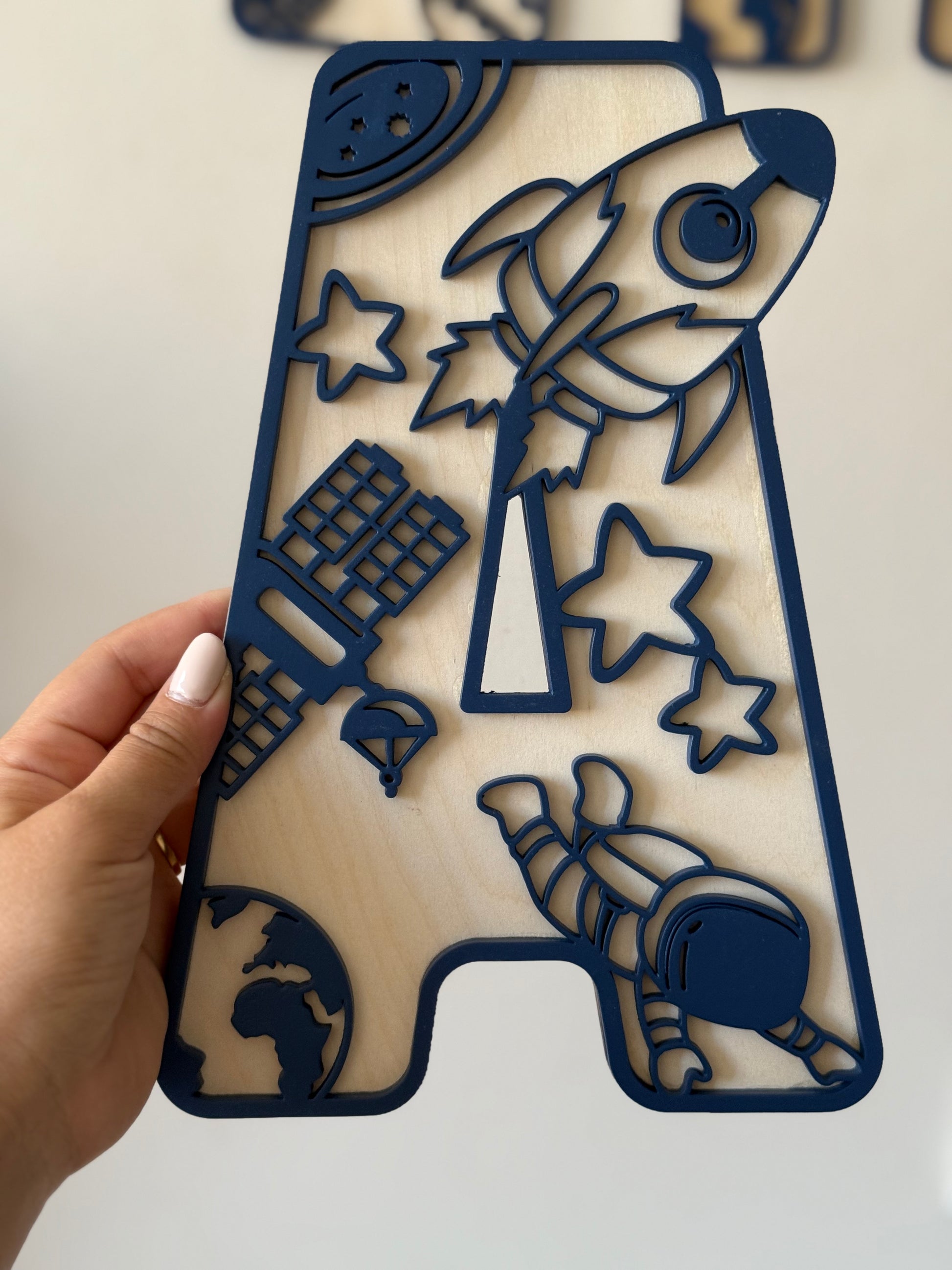 Each letter is designed with playful cosmic details — astronauts, rockets, stars, planets, and satellites — creating a beautiful 3D layered effect. Made from natural wood and topped with matte wood, these letters bring a fun and modern touch to any nursery or kids’ room.