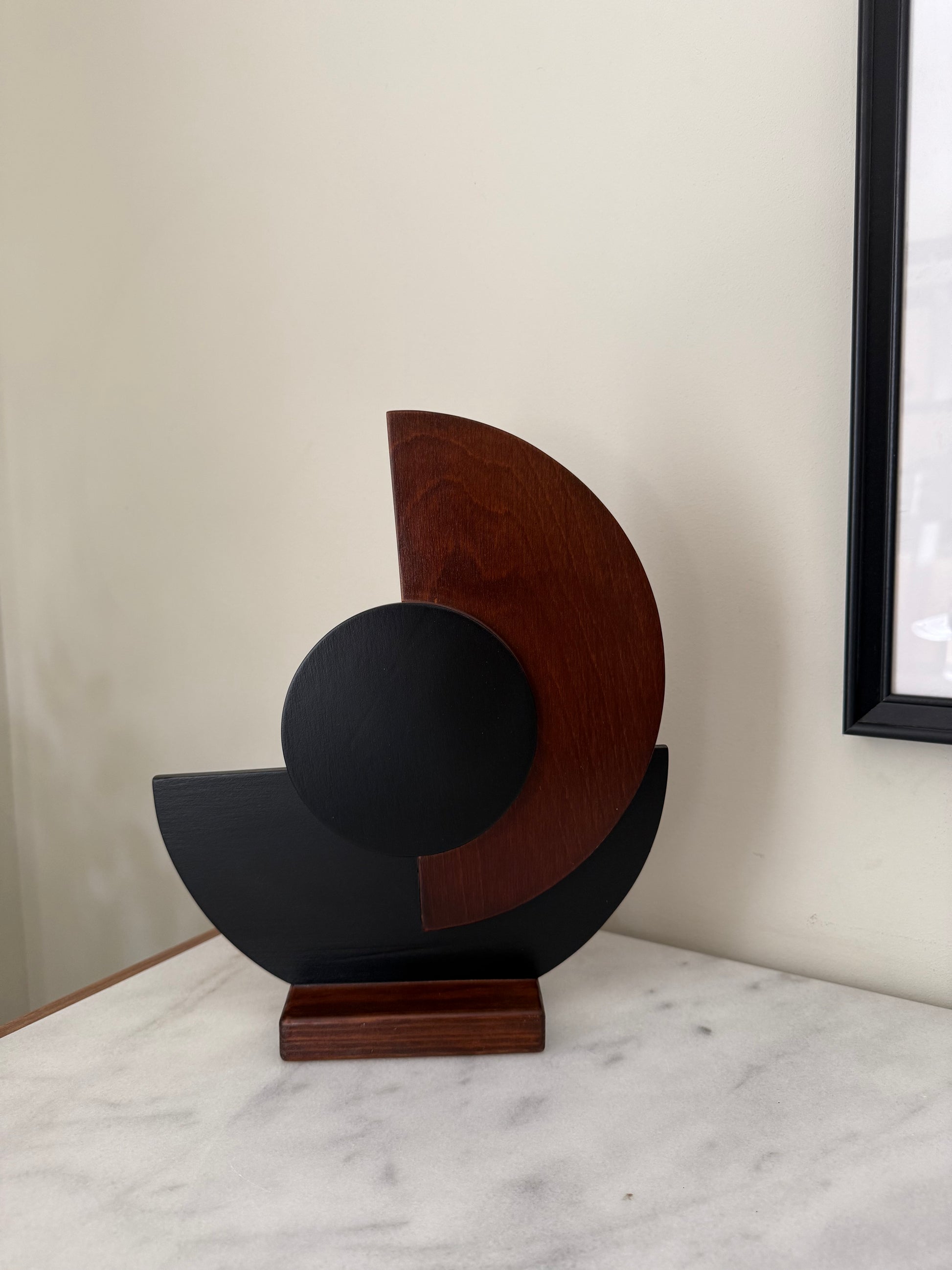 Striking and harmonious, Eclipse captures the beauty of celestial alignment. With its intersecting half-moon forms and central circle, this handcrafted sculpture symbolizes the rare balance of light and shadow during an eclipse. The contrast of matte black and rich wood tones adds depth and warmth, making it a timeless accent for any space.
