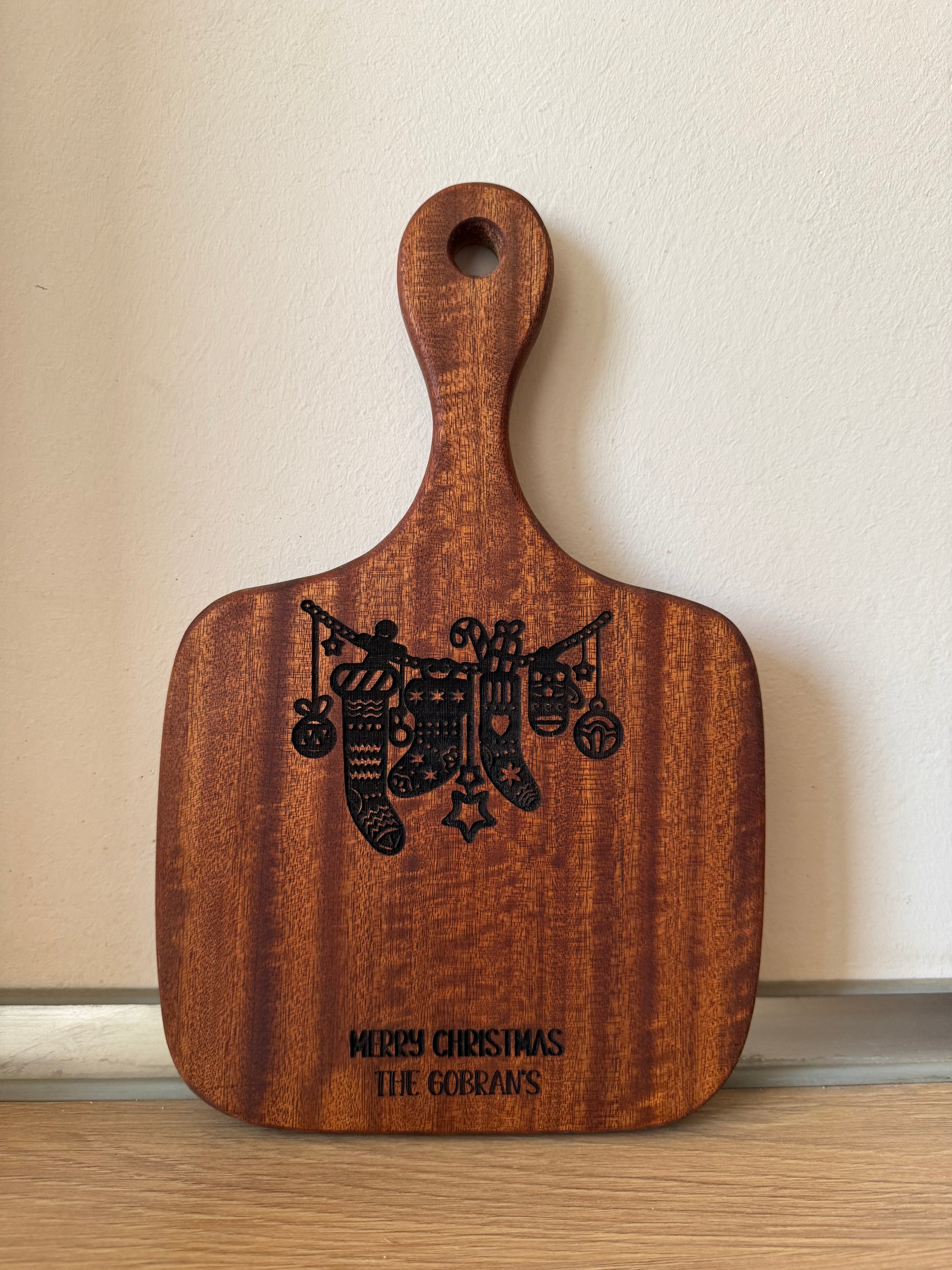 Add a warm festive touch to your home this season with our Festive Stockings Serving Board. Crafted from rich mahogany-style wood and engraved with a charming Christmas stockings design, this piece is perfect for serving treats, decorating your table, or gifting to loved ones.