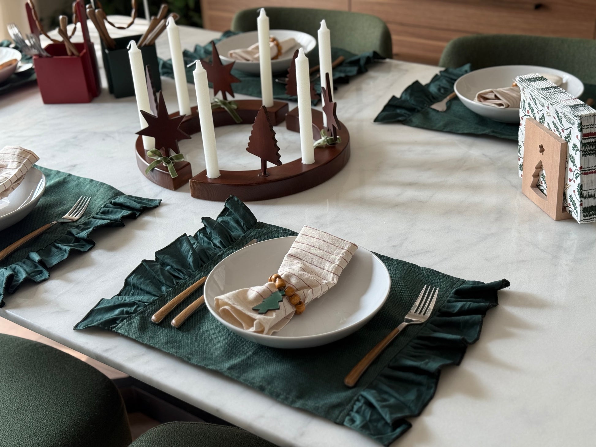 Crafted in a deep forest green fabric with soft ruffled edges, this collection adds a warm, sophisticated touch to any holiday tablescape.