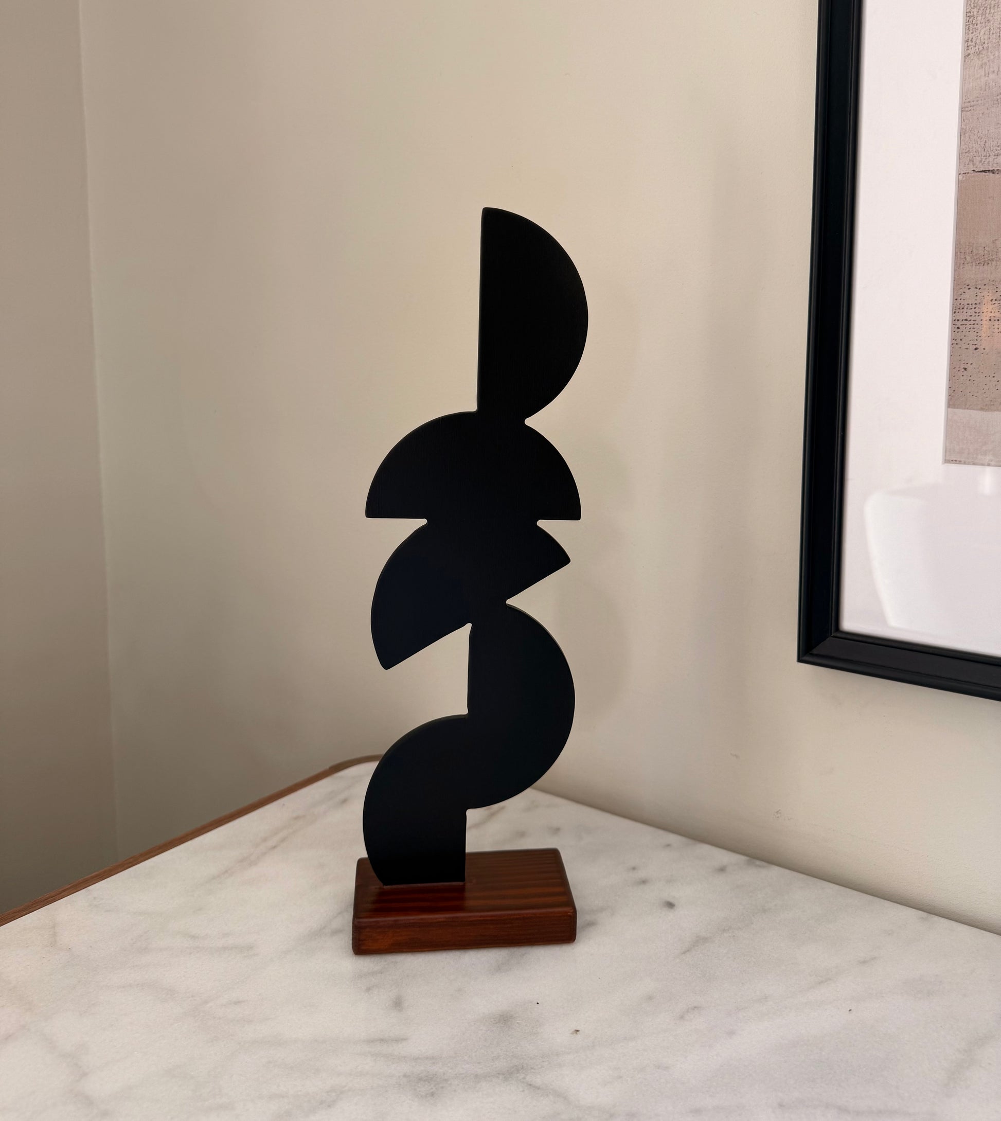 Elevate your space with Lunaris, a striking abstract sculpture that embodies the rhythm of celestial movement. Crafted from solid wood with a deep matte black finish, its fluid curves and stacked half-moon forms capture the essence of lunar phases in perfect harmony. Resting on a warm wooden base, Lunaris brings a modern yet organic presence to any interior.