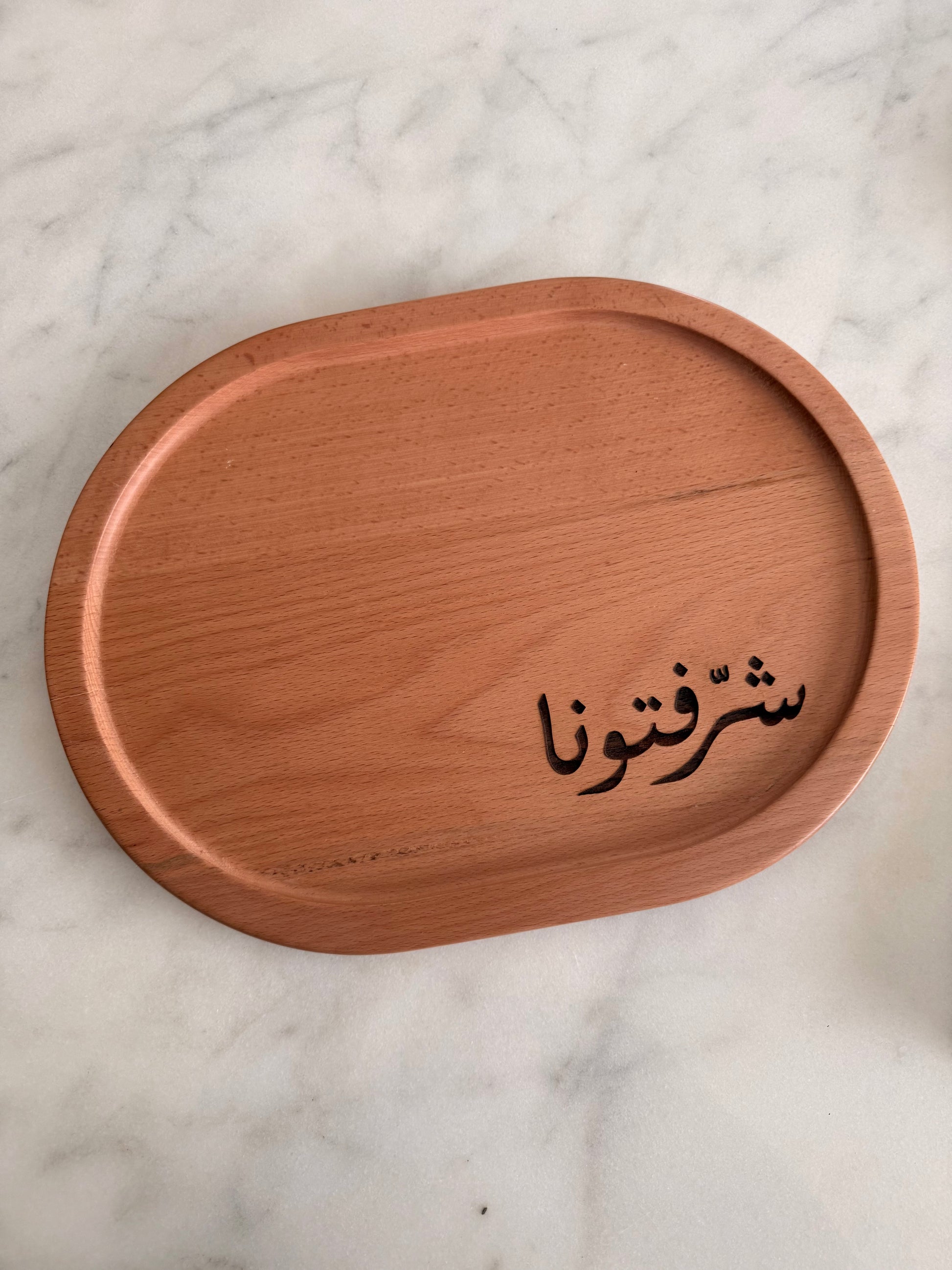 The Wooden Iftar Serving Tray is thoughtfully crafted from natural wood and engraved with warm Arabic welcoming words, adding meaning and intention to every gathering.