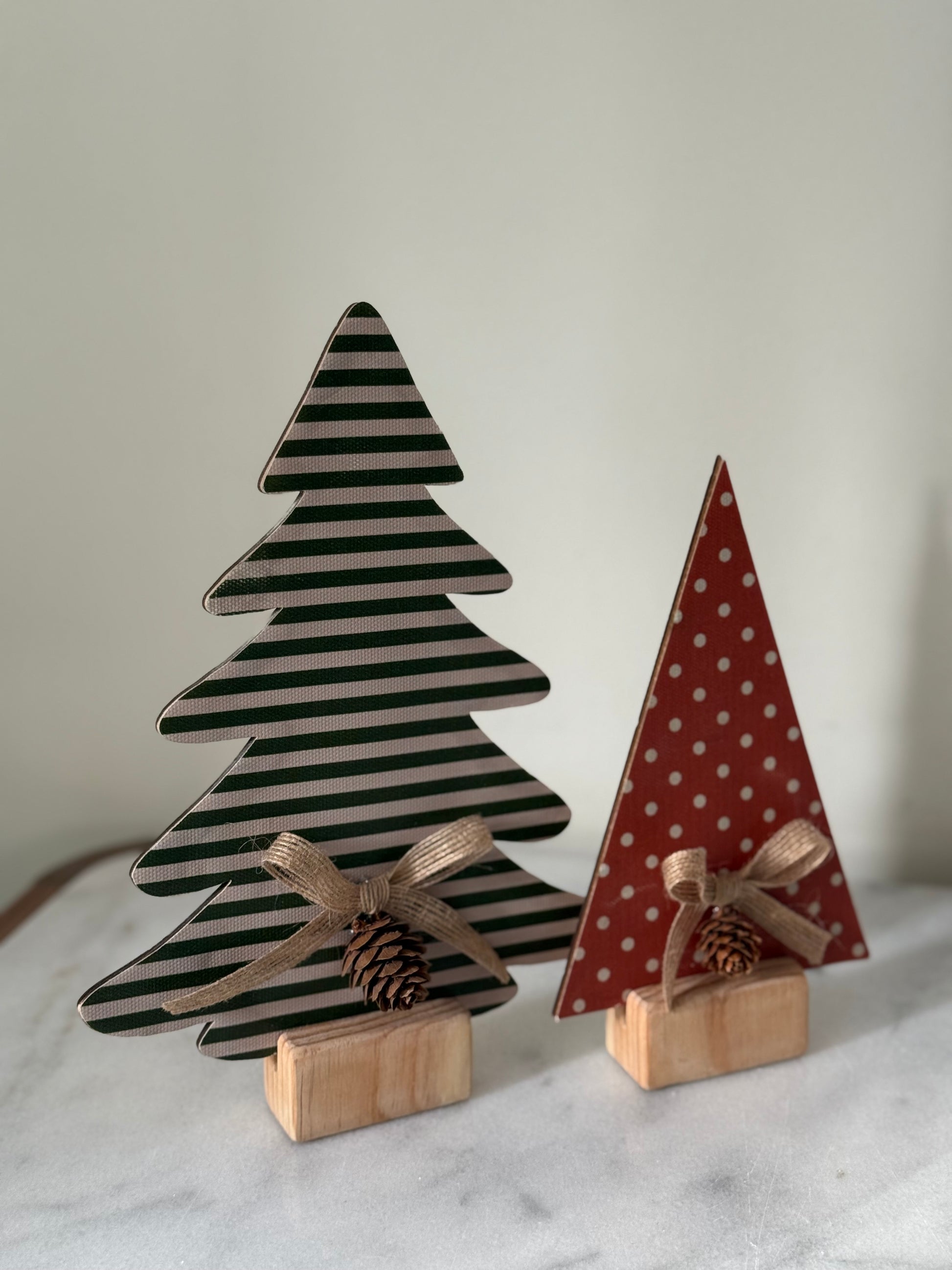 Bring a cozy festive touch to your home with our Stripes & Dots Trees. This set features two charming standing wooden trees — one in classic green stripes and the other in red polka dots — each finished with a natural jute bow and a mini pinecone detail.