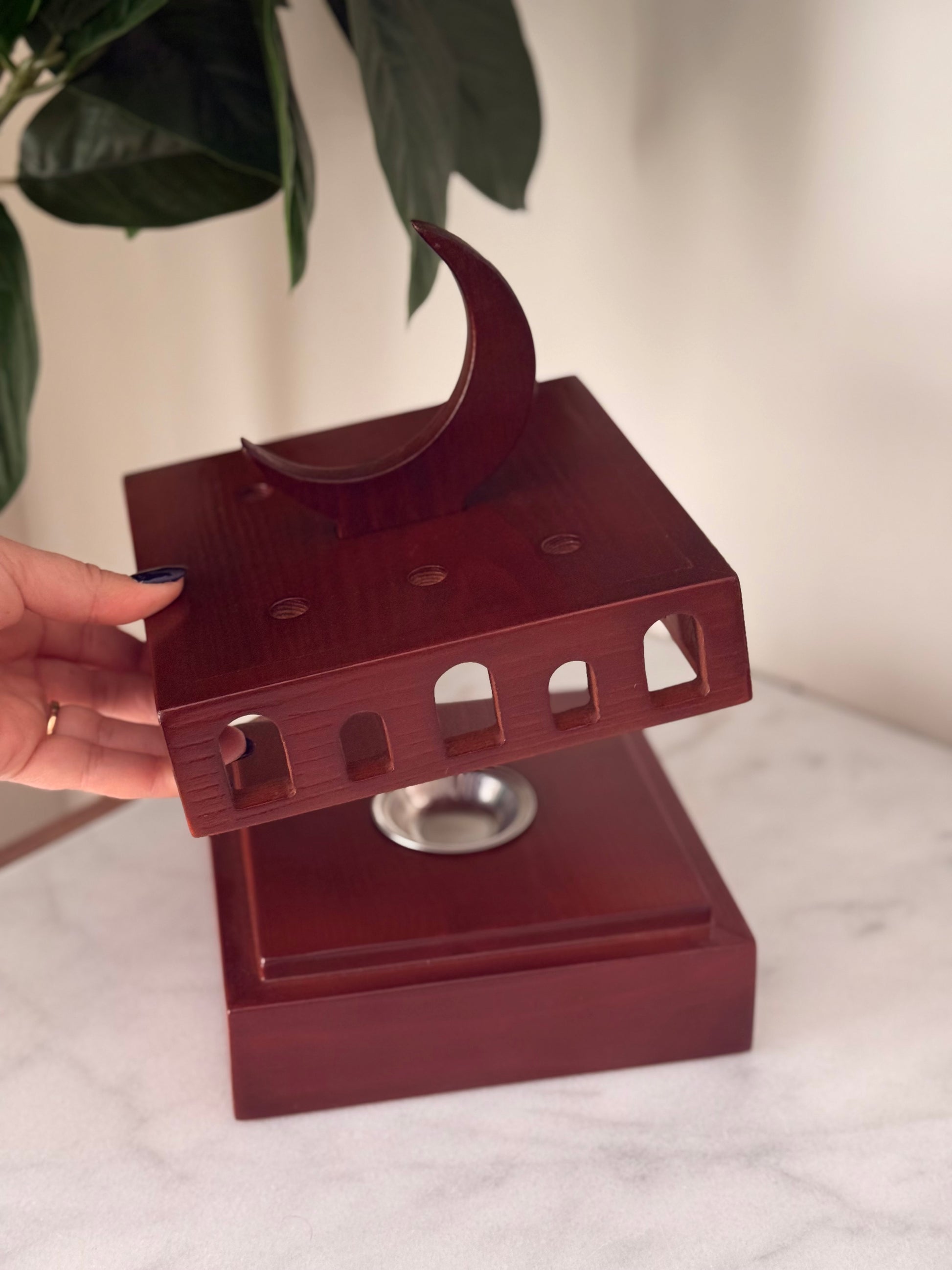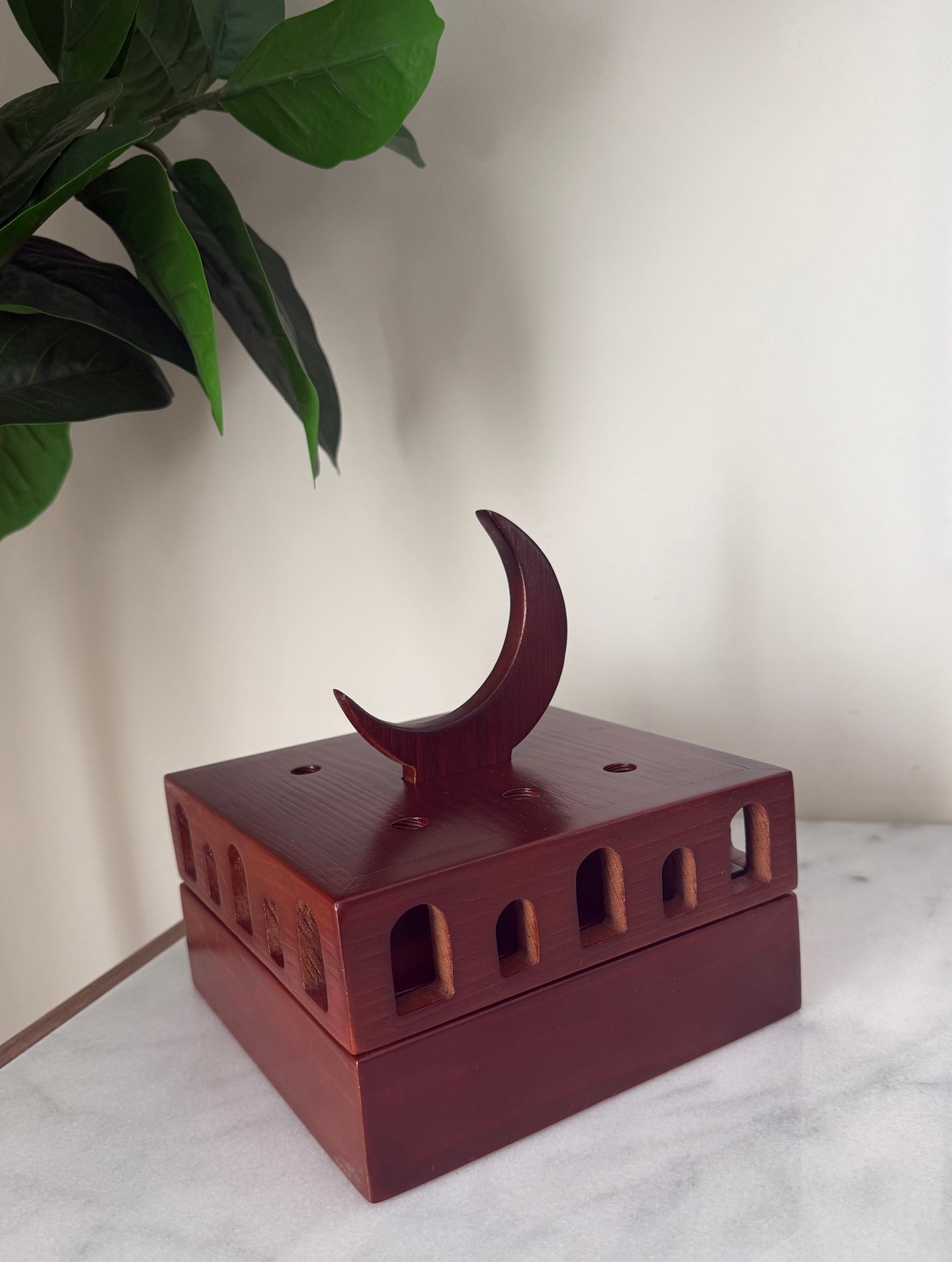Create a serene and soulful atmosphere with the Crescent Incense Burner. Thoughtfully crafted from rich, dark-stained wood, this incense burner features a sculptural crescent moon centerpiece inspired by timeless Islamic and Ramadan symbolism.
